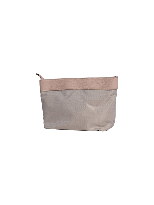 • Material: The exterior is crafted from a soft, blush-pink (nude) pebble-grain faux leather, providing a textured, sophisticated finish.